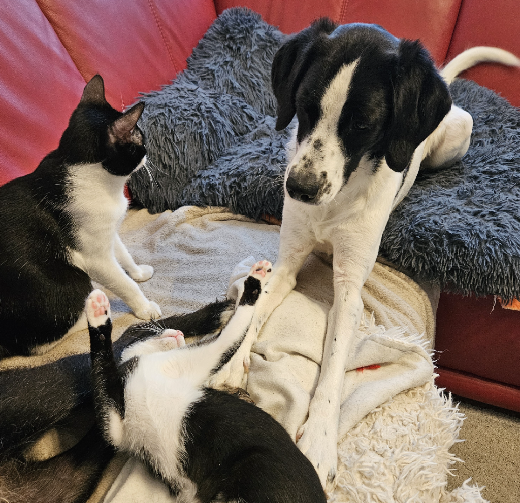 Katzen: mit den eigenen Katzen eng verbunden. Draußen geht er hinter fremden Katzen hinterher.