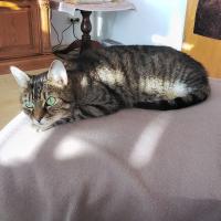 Merlin ist sehr zutraulich und verschmust. Leider auch ziemlich verfressen, und seine Vorlieben was das Futter betrifft mag er nur Felix alle Sorten mit Fisch und Purina mit Lachs Geschmack. Es wäre auch wichtig zu wissen, das Merlin leider die Angewohnheit hat das Futter schnell zu verschlingen, so daß er oft erbricht.